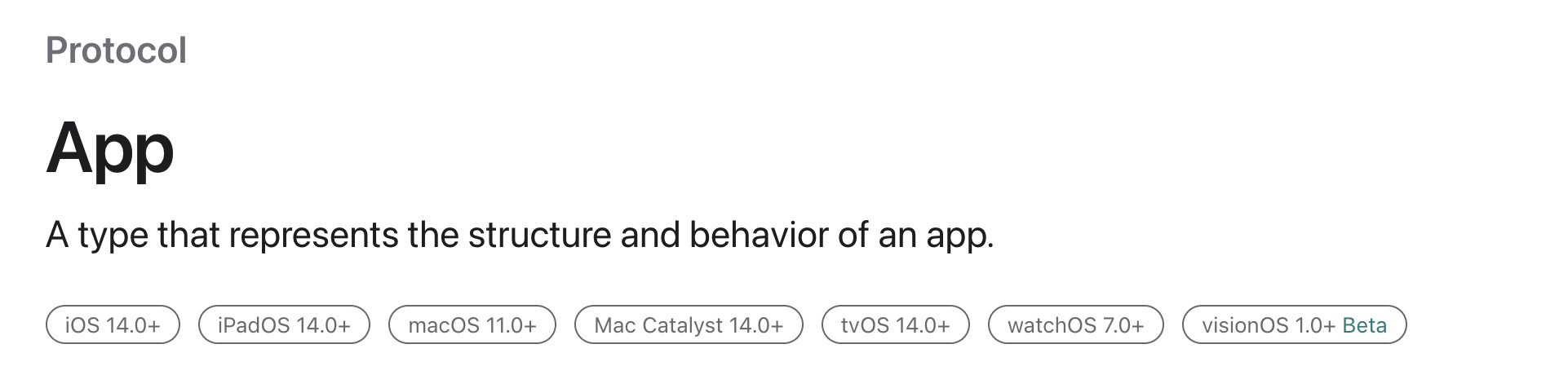 - 시스템에서 앱을 실행시킬 때 main() 메서드를 호출한다. App 프로콜이 main()의 default 구현을 제공